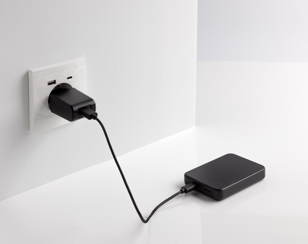 5.000 mAh powerbank van zakformaat met USB C input/output poort en een extra USB A-poort. De behuizing is gemaakt van RCS-gecertificeerd gerecycled ABS-plastic. RCS (Recycled Claim Standard) is een norm om het gerecyclede gehalte van een product door de hele toeleveringsketen te verifiëren. Totaal gerecycled gehalte: 25% op basis van het totale productgewicht. Wanneer de powerbank volledig is opgeladen, biedt hij voldoende energie om je mobiele telefoon tot twee keer toe op te laden. De powerbank bevat een duurzame grade A 5.000 mAh lithium-polymeerbatterij. De stroomindicatoren geven het resterende energieniveau aan, zodat je altijd weet wanneer je moet opladen. Type-C Input: 5V/2.4A; USB A-output: 5V/2.4A, Type-C output: 5V/2A. Het artikel en de accessoires zijn PVC-vrij. Inclusief RCS-gecertificeerde gerecyclede TPE-oplaadkabel. Verpakt in FSC® mix verpakking.