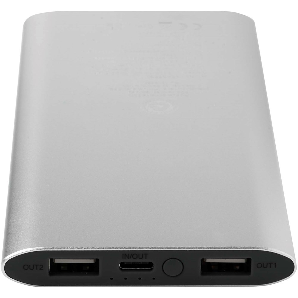 Powerbank met Type-C in/uitgangspoort en 2 x USB-A-poorten, wat betekent dat drie apparaten tegelijk kunnen worden opgeladen. Het ondersteunt ook 5 W draadloos opladen voor alle apparaten met Qi. De powerbank heeft een 8000 mAh lithium-polymeerbatterij die een totaal uitgangsvermogen levert van max. 10 W. Deze powerbank is gemaakt van 28% RCS gecertificeerd gerecycled plastic. Geleverd met een TPE Type-C naar USB-A-oplaadkabel.