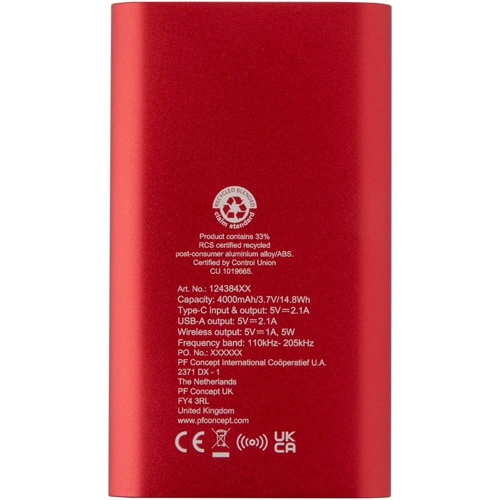 Powerbank met Type-C in/uitgangspoort en een USB-A-poort waardoor twee apparaten tegelijk kunnen worden opgeladen. Het ondersteunt ook 5 W draadloos opladen voor alle apparaten met Qi. De powerbank heeft een 4000 mAh lithium-polymeerbatterij die een totaal uitgangsvermogen levert van max. 10 W. Deze powerbank is gemaakt van 28% RCS gecertificeerd gerecycled plastic. Geleverd met een TPE Type-C naar USB-A-oplaadkabel.