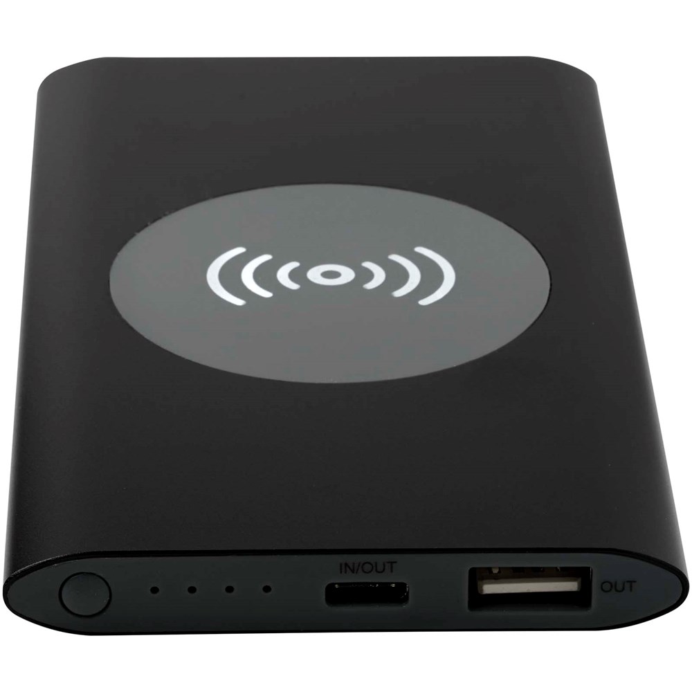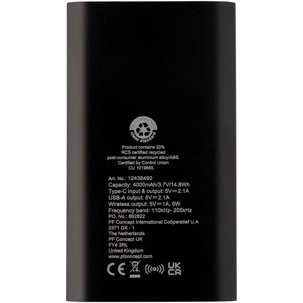 Powerbank met Type-C in/uitgangspoort en een USB-A-poort waardoor twee apparaten tegelijk kunnen worden opgeladen. Het ondersteunt ook 5 W draadloos opladen voor alle apparaten met Qi. De powerbank heeft een 4000 mAh lithium-polymeerbatterij die een totaal uitgangsvermogen levert van max. 10 W. Deze powerbank is gemaakt van 28% RCS gecertificeerd gerecycled plastic. Geleverd met een TPE Type-C naar USB-A-oplaadkabel.